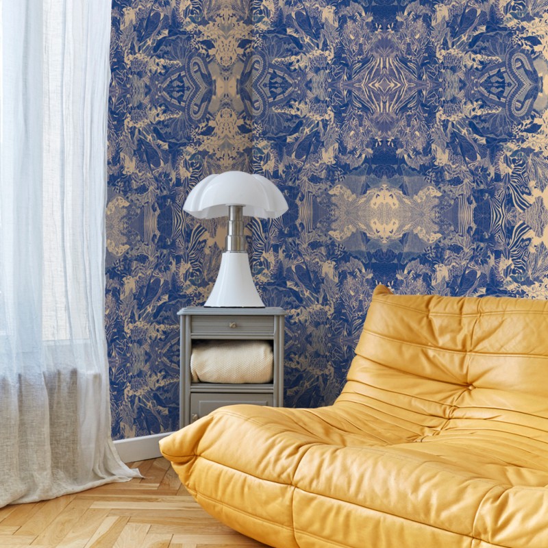 Perfect in a chic and sober interior, noble raw materials, with simple lines to counterbalance the exuberance of the wallpaper.