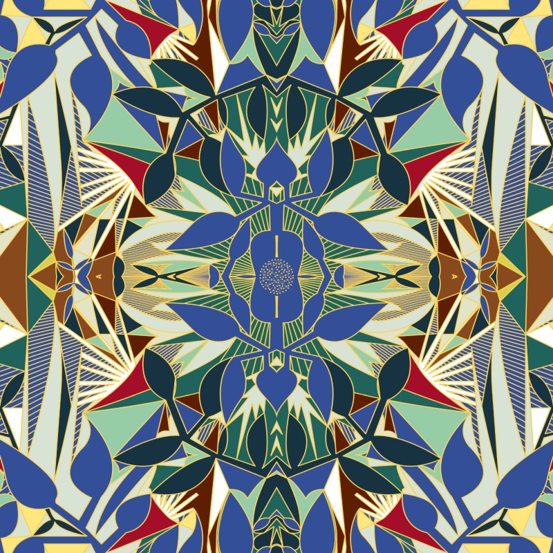 • Composition florale géométrique aux motifs curvilignes complexes rappelant les tapis persans