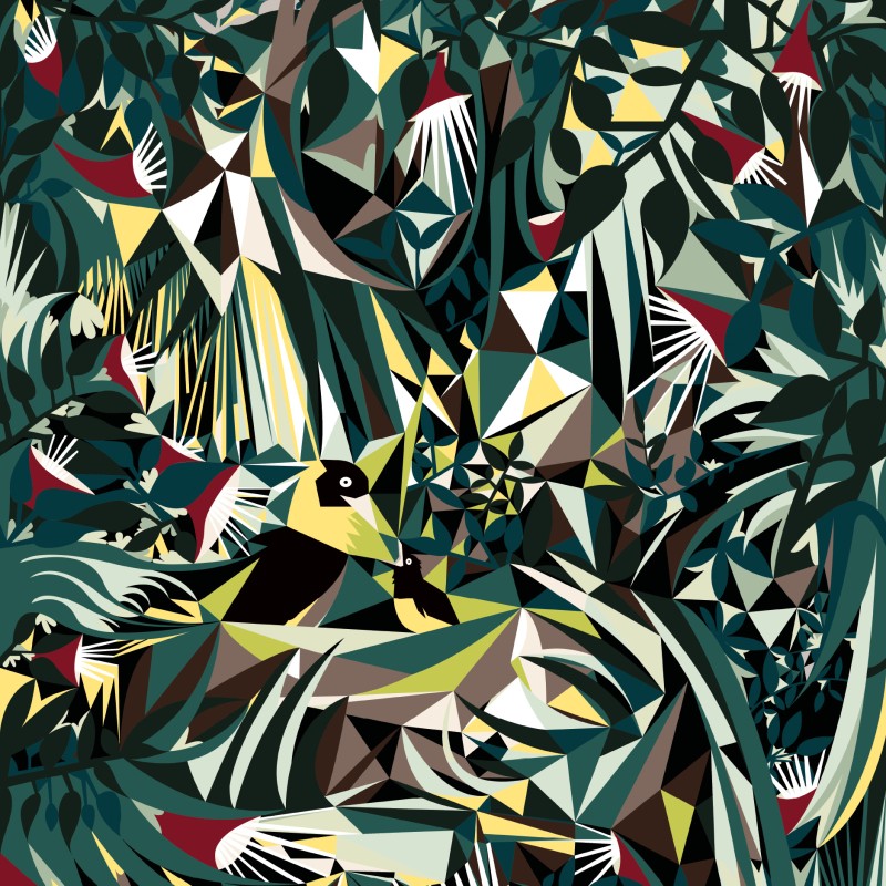 À l'ombre de son feuillage, ce papier peint dévoile une forêt luxuriante et graphique, où un oiseau a fait son nid.