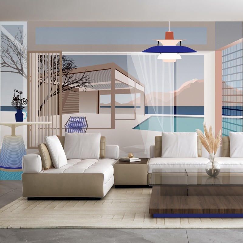 Redessinez votre intérieur avec ce papier peint trompe l’œil design, qui vous offrira sa terrasse, sa piscine, et ses montagnes au loin